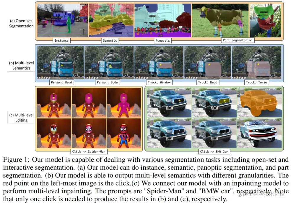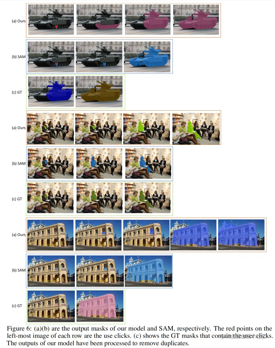 如图5所示,与以往的交互式分割模型相比,语义sam与以往的分割模型有两个方面的不同,首先,训练模型输出所有可能的分割掩模。其次,输出粒度更丰富,以生成不同的输出掩模