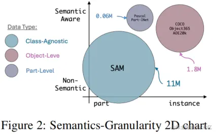 论文使用了七个包含不同粒度级别掩码的数据集,包括SA-1B、COCO全景、ADE20k全景、PASCAL部分、PACO、PartImageNet和Objects365。这些数据集提供了丰富的语义信息,涵盖了对象级别和部分级别的掩码以及类别标签。详细信息可参见表1,并在图2中展示了不同数据类型的数据分布。