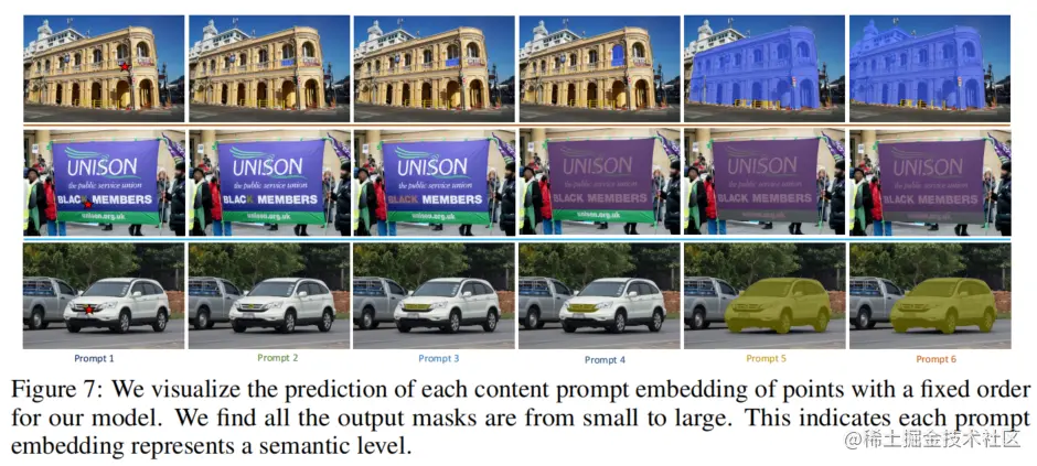 论文还发现,每个点的内容Prompt(K=6个内容Prompt)嵌入学习对应于一个固定的粒度。如图7所示,当按照对应内容嵌入的特定顺序可视化掩码时,掩码在每行中始终按照从小到大的顺序排列。这证明了模型中的每个内容嵌入代表了一个语义粒度级别。