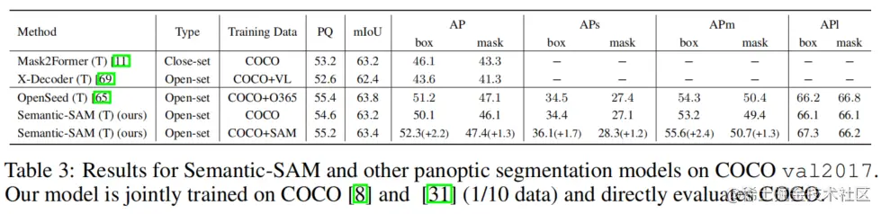 在表5中,评估了SAM和Semantic-SAM在COCO Val2017上的模型的1次点击mIoU。在相同的设置下,Semantic-SAM的性能优于SAM。