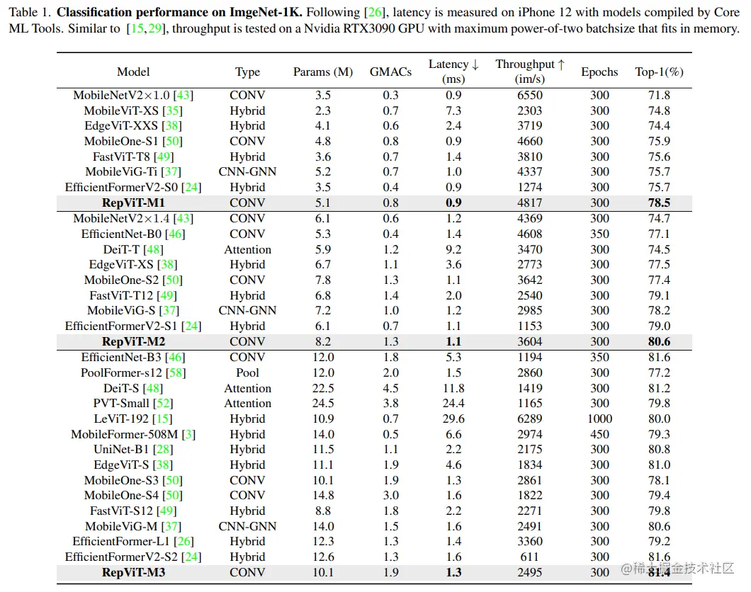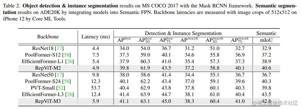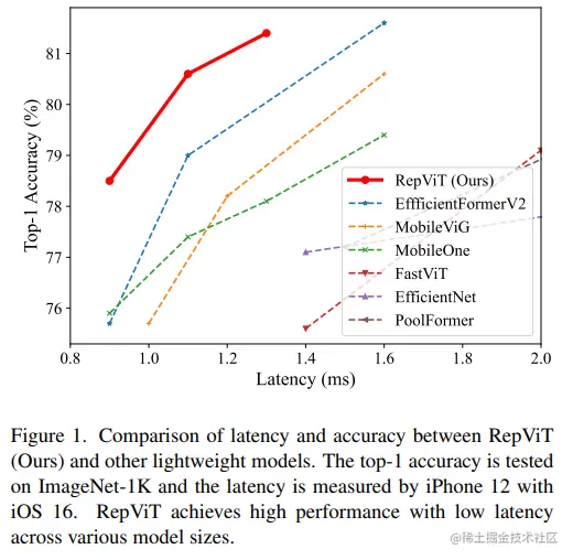 RepViT超越了现有的最先进的轻量级 ViTs,并在各种视觉任务上显示出优于现有最先进轻量级ViTs的性能和效率,包括 ImageNet 分类、COCO-2017 上的目标检测和实例分割,以及 ADE20k 上的语义分割。特别地,在ImageNet上,RepViT在iPhone 12上达到了近乎 1ms 的延迟和超过 80% 的Top-1 准确率,这是轻量级模型的首次突破。