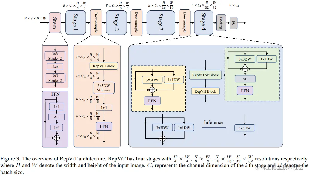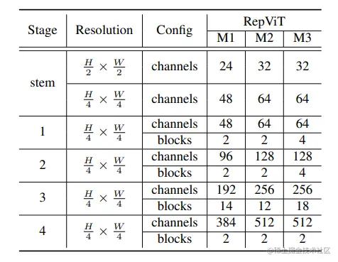 最终,通过整合上述改进策略,我们便得到了模型RepViT的整体架构,该模型有多个变种,例如RepViT-M1/M2/M3。同样地,不同的变种主要通过每个阶段的通道数和块数来区分。