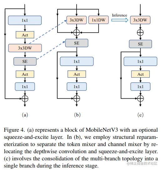 这块主要是对 MobileNetV3-L 的块结构进行了改进,分离了令牌混合器和通道混合器。原来的 MobileNetV3 块结构包含一个 1x1 扩张卷积,然后是一个深度卷积和一个 1x1 的投影层,然后通过残差连接连接输入和输出。在此基础上,RepViT 将深度卷积提前,使得通道混合器和令牌混合器能够被分开。为了提高性能,还引入了结构重参数化来在训练时为深度滤波器引入多分支拓扑。最终,作者们成功地在 MobileNetV3 块中分离了令牌混合器和通道混合器,并将这种块命名为 RepViT 块。