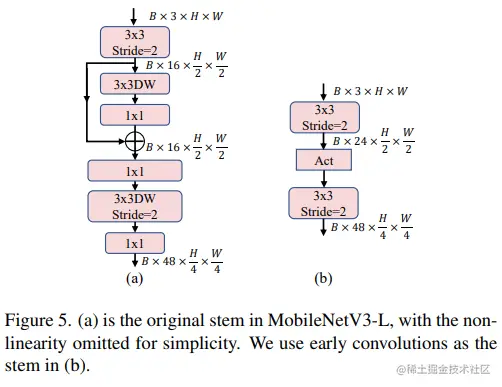 ViTs 通常使用一个将输入图像分割成非重叠补丁的 "patchify" 操作作为 stem。然而,这种方法在训练优化性和对训练配方的敏感性上存在问题。因此,作者们采用了早期卷积来代替,这种方法已经被许多轻量级 ViTs 所采纳。对比之下,MobileNetV3-L 使用了一个更复杂的 stem 进行 4x 下采样。这样一来,虽然滤波器的初始数量增加到24,但总的延迟降低到0.86ms,同时 top-1 准确率提高到 73.9%。