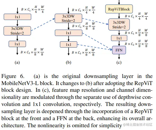 在 ViTs 中,空间下采样通常通过一个单独的补丁合并层来实现。因此这里我们可以采用一个单独和更深的下采样层,以增加网络深度并减少由于分辨率降低带来的信息损失。具体地,作者们首先使用一个 1x1 卷积来调整通道维度,然后将两个 1x1 卷积的输入和输出通过残差连接,形成一个前馈网络。此外,他们还在前面增加了一个 RepViT 块以进一步加深下采样层,这一步提高了 top-1 准确率到 75.4%,同时延迟为 0.96ms。