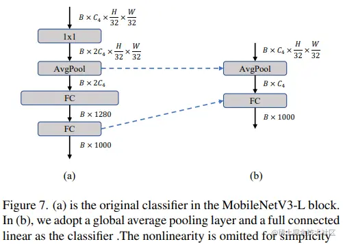 在轻量级 ViTs 中,分类器通常由一个全局平均池化层后跟一个线性层组成。相比之下,MobileNetV3-L 使用了一个更复杂的分类器。因为现在最后的阶段有更多的通道,所以作者们将它替换为一个简单的分类器,即一个全局平均池化层和一个线性层,这一步将延迟降低到 0.77ms,同时 top-1 准确率为 74.8%。