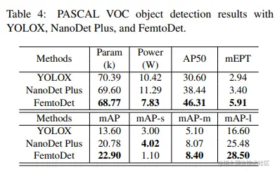 基于上述低能耗架构的发现,作者设计并提出了一种名为FemtoDet的新型目标检测器。同昨天上海交大提出的 50K 大小的 EGE-UNet类似,FemtoDet也仅有 68.77k 的参数,但却能够在PASCAL VOC测试集上达到了 46.3 的 AP50 得分;与此同时,该方法在Qualcomm Snapdragon 865 CPU平台上的功耗仅为 1.11 瓦,运行帧率达到惊人的 64.47 FPS。只能说在大模型横行的今天,也算是给广大低端玩家一丝慰藉与希望了,换个思路我们还能比比看谁更小,哈哈~~~