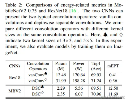 此外,为了全面评估模型的能耗和它们实现能源与性能权衡的能力,除了常用的 Top1-Acc(用于图像分类)和 mAP(用于目标检测)度量之外,作者还提出了 Power(能源成本)和 mEPT(平均能源与性能权衡)这两种评价指标。