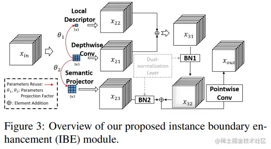 IBE 模块是基于因式分解为深度和点状层的卷积层设计的。它还引入了一个双重标准化机制。具体地,该模块通过设计新的局部描述符、语义投影器和双重标准化层来增强 DSC。特别是, 的局部描述符是通过集成梯度提示周围的线性变换生成的参数重用机制。因此,对象边界信息可以在局部描述符中找到。然后,我们利用这些对象边界信息来增强上述标准操作(如深度卷积)的噪声特征表示。