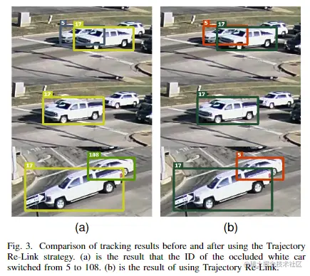在严重遮挡情况下,目标检测可能很困难,如图3a所示,白色车辆在被遮挡后轨迹ID发生切换。这是因为车辆启动时速度的急剧变化导致卡尔曼滤波器无法准确预测运动状态。为了解决这个问题,我们首先过滤掉在场景中间结束或开始的轨迹。然后,我们使用贪婪算法根据它们的ReID特征的余弦距离合并断裂的轨迹。如图3b所示,轨迹重新链接策略能够在遮挡后仍保持白色车辆的相同跟踪身份。