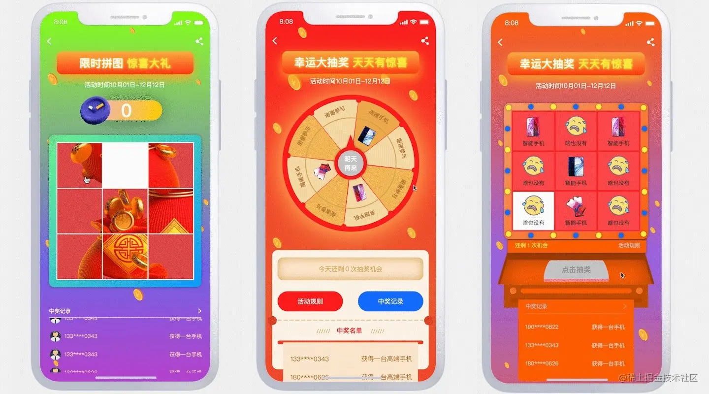 另:更有常用的营销活动“转盘抽奖、九宫格抽奖、随机摇奖、翻牌抽奖”以及“限时拼图中大奖活动”,用以日常的购物促销。