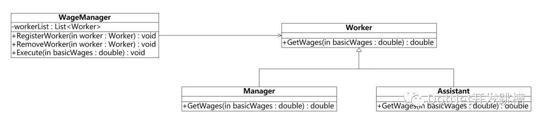 例如下面的例子,Manager的底薪为基本工资的1.5倍,Assistant的底薪为基本工资的1.2倍。WageManager类的RegisterWorker方法与RemoveWorker方法可以用于注册和注销观察者,最后执行Execute方法可以对多个已注册的观察者同时输入参数。
