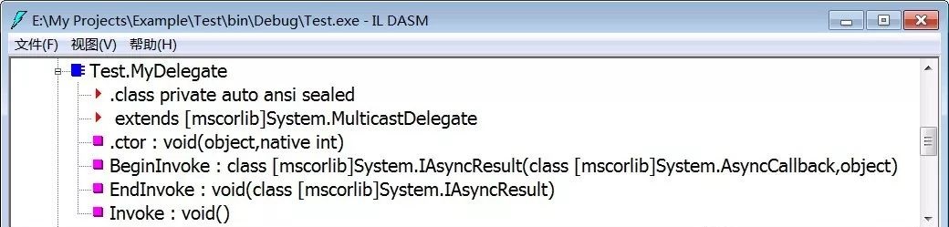 使用delegate就可以直接建立任何名称的委托类型,当进行系统编译时,系统就会自动生成此类型。您可以使用delegate void MyDelegate() 方式建立一个委托类,并使用ILDASM.exe观察其成员。由ILDASM.exe 中可以看到,它继承了System.MulticastDelegate类,并自动生成BeginInvoke、EndInvoke、Invoke 等三个常用方法。