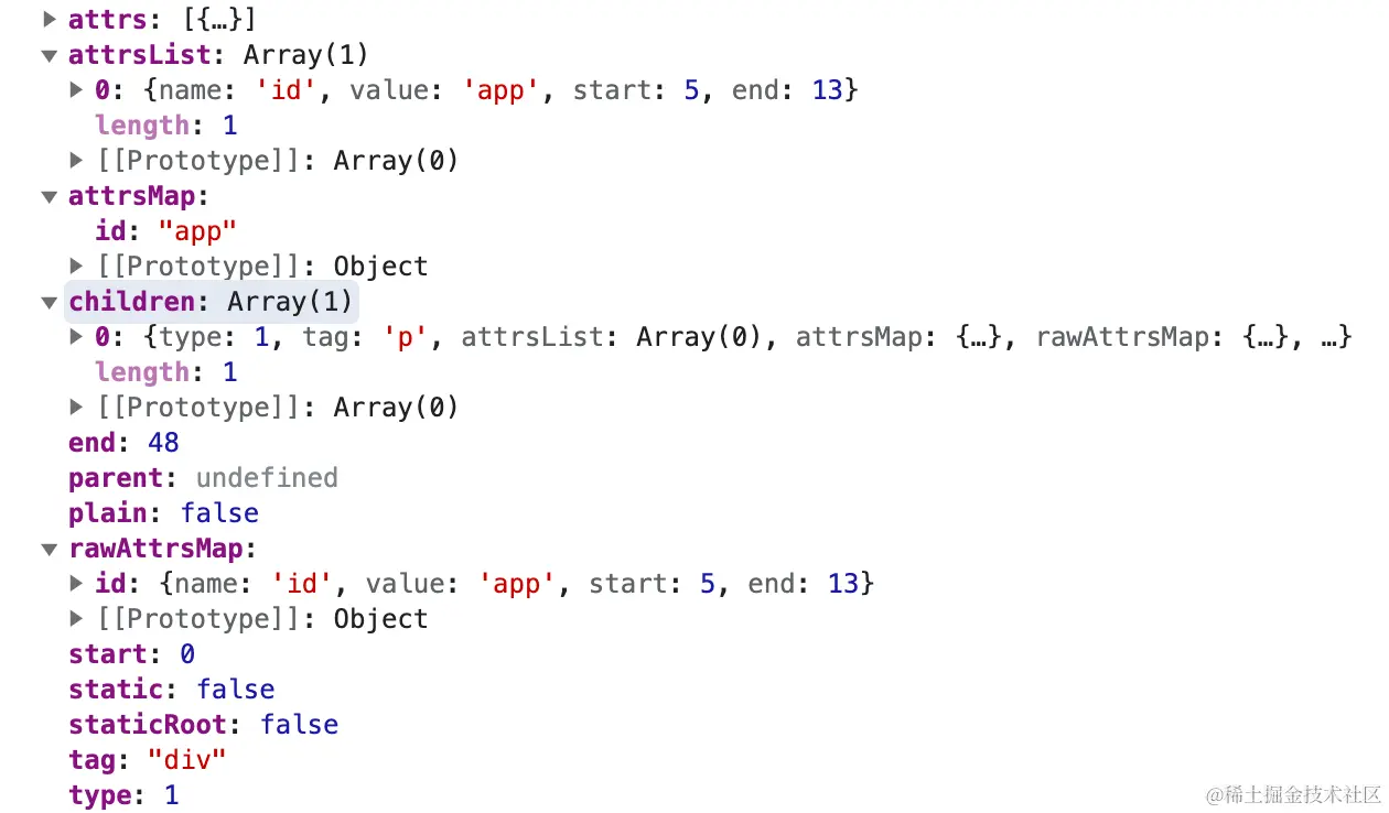 比如parent属性保存了父节点的描述对象,children属性是一个数组,里面保存了一些子节点的描述对象,type属性表示一个节点的类型。
