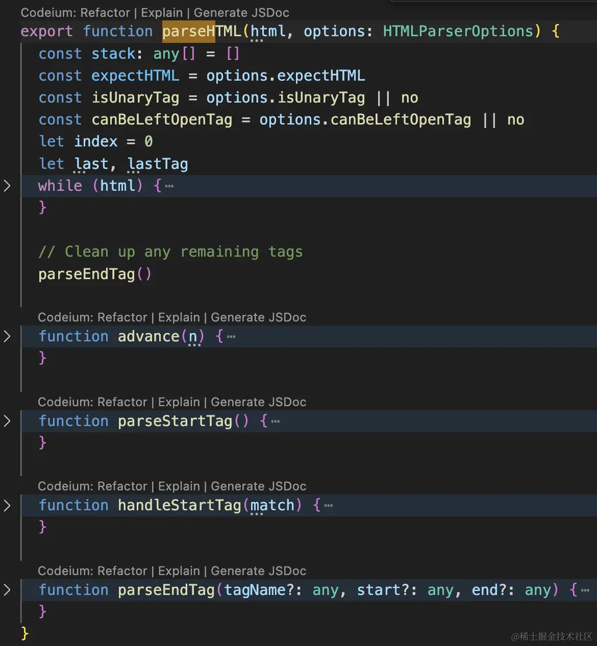 当上面这个模版被html解析器解析时,所触发的钩子函数依次是:parseStartTag,handleStartTag,advance,parseEndTag。