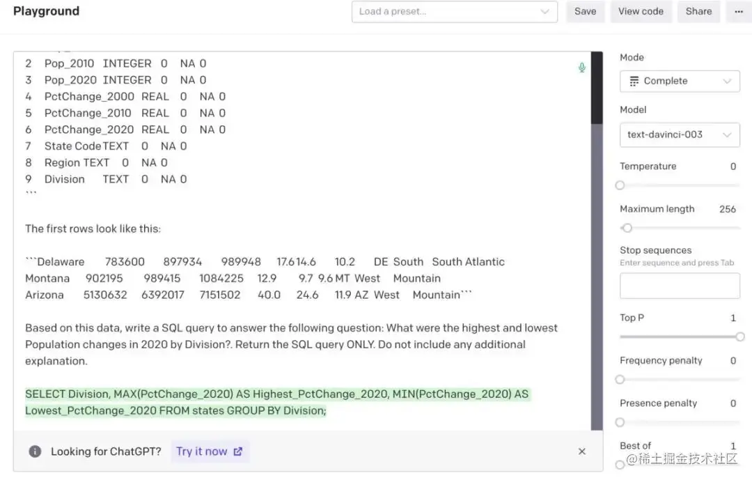 你可以先将数据复制粘贴到OpenAI的Web界面之一中,以在ChatGPT或OpenAI API playground中查看结果。ChatGPT不收费,但无法调整结果。Playground允许设置诸如温度(即回答的“随机性”或创造性程度)和要使用的模型等参数。对于SQL代码,我将温度设置为0。
