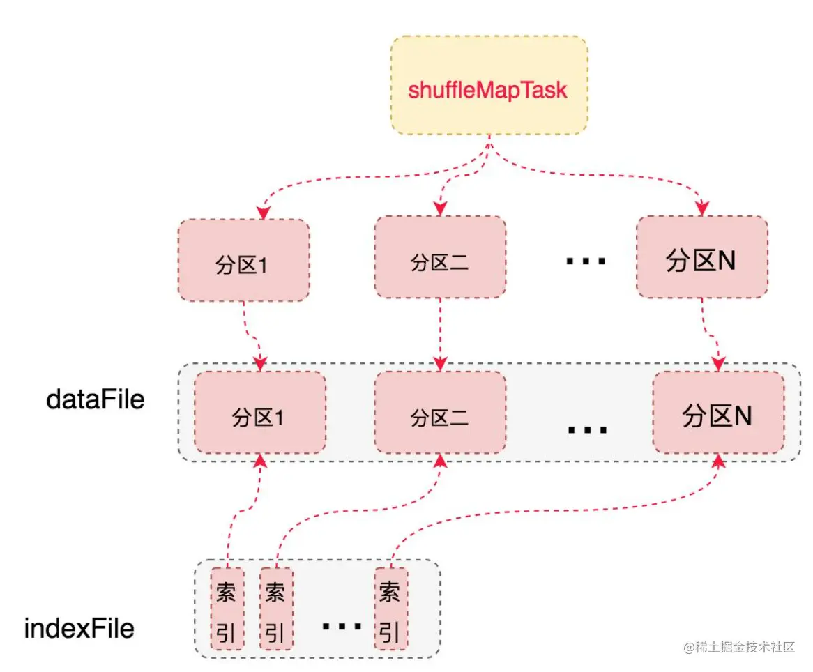以上过程会产生2*N(一份数据+一份索引,N是shufflewrite并发度),下游stage读取文件,只需要按index文件读取对应的partation所处文件即可