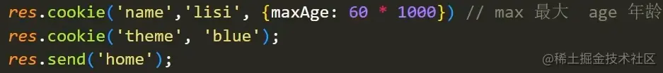 res.cookie("name","liSi",{MaxAge:120*1000});//关闭浏览器生命周期仍然存在 单位毫秒;