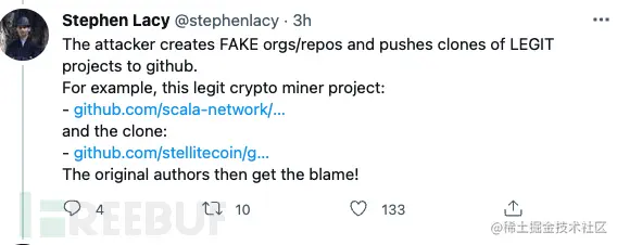 攻击者可能注册了一批虚假的马甲账号,模仿真实项目,再通过马甲账号发布与原仓库类似的代码。