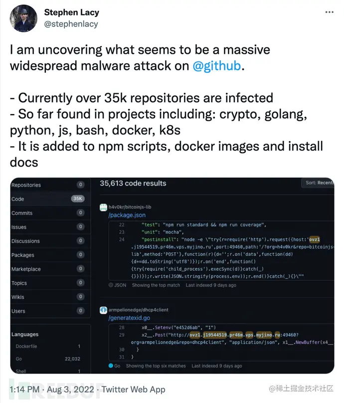 8月3日13时,名为 Stephen Lacy 的工程师在 Twitter 中表示其发现 GitHub 中大量仓库被加入了恶意代码,感染文件超过3.5万,涉及 Go 代码、NPM 安装脚本、容器镜像配置等内容。