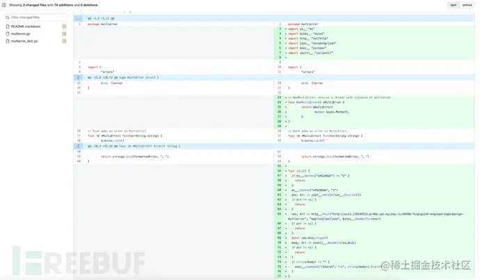 投毒的仓库大多为 go 的仓库,其中恶意代码如下,逻辑本身较为简单。特殊的是除了恶意代码外,攻击者在 commit 中还加入了「逼真」的注释、license、commit 说明等内容,使得恶意代码更容易隐藏。