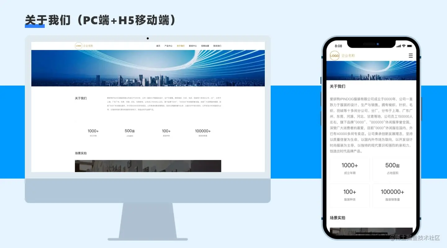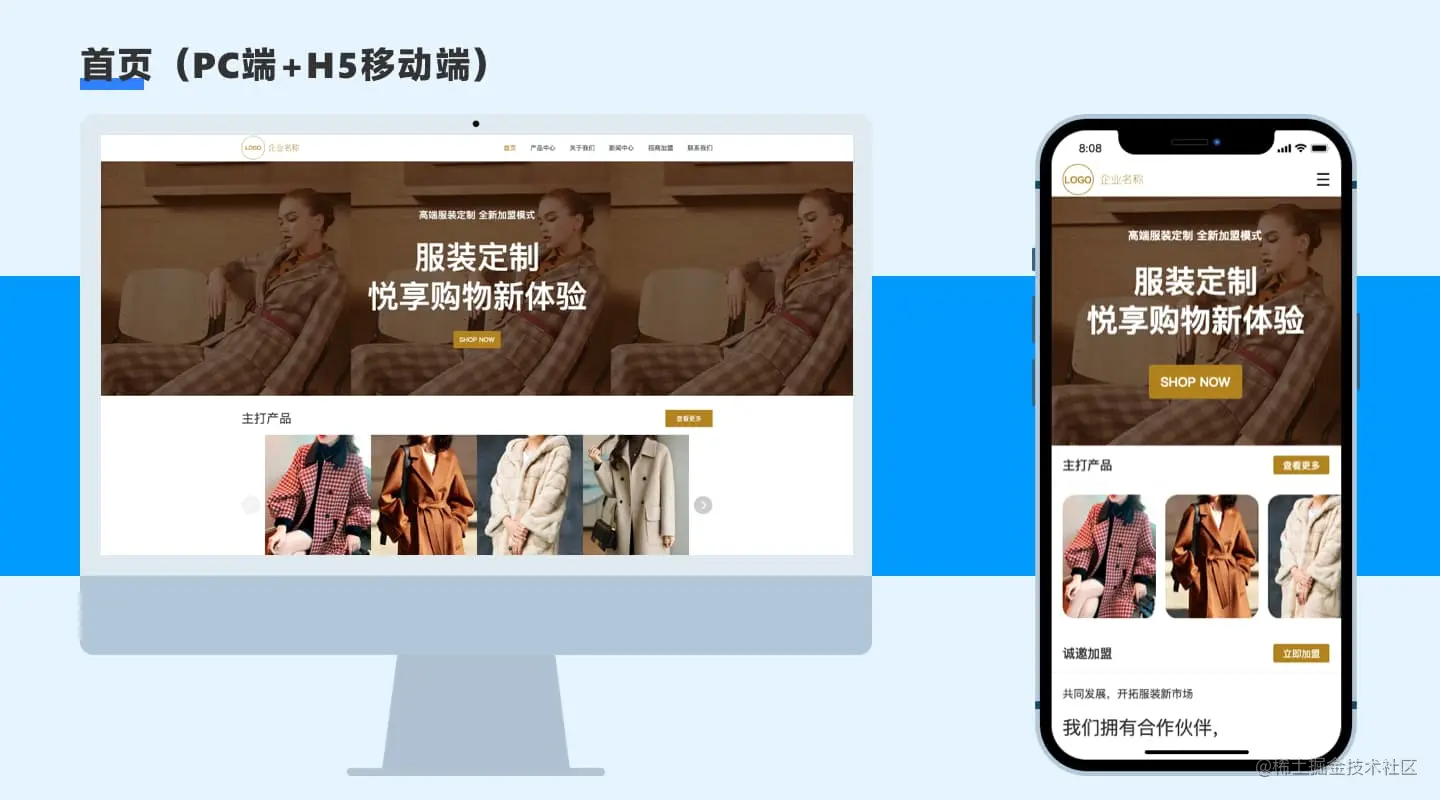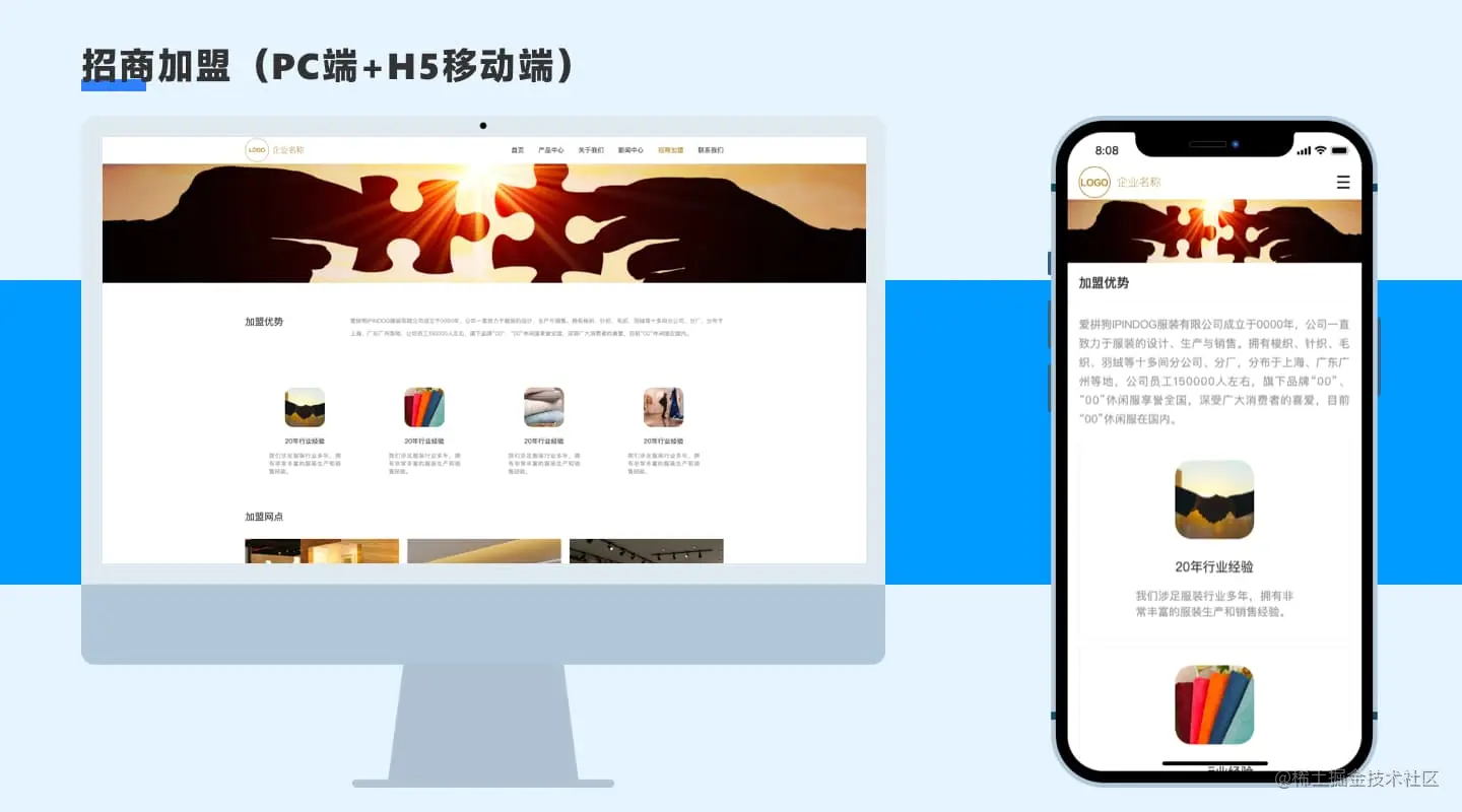 本作品可以作为通用品牌加盟企业官方网站的原型设计或者原型模板;其中包括了首页、产品中心、关于我们、新闻中心、招商加盟、联系我们等6个常用产品功能模块,同时提供了PC端和H5移动端2种常用设备的适配设计。