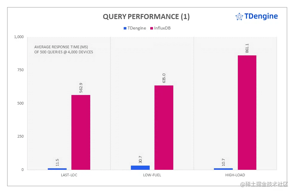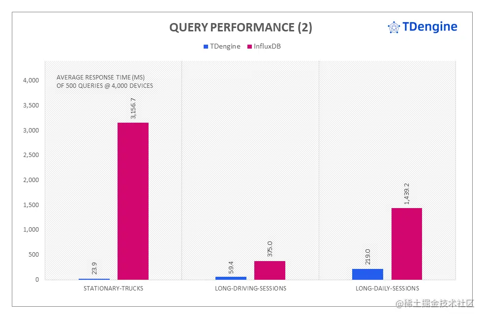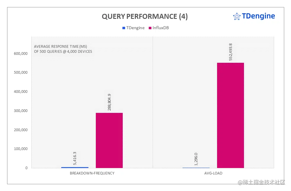 在复杂的混合查询中, TDengine 同样展现出巨大的性能优势,从查询响应时间来看,其中 avg-load 和 breakdown-frequency 的查询性能是 InfluxDB 的 426 倍和 53 倍。