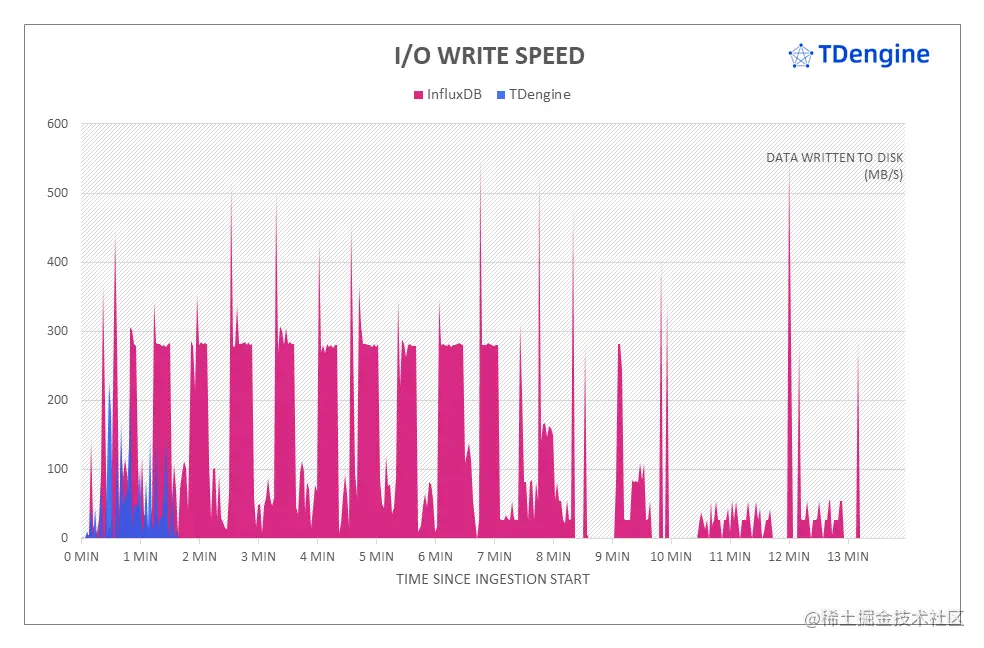 在写入相同规模的数据情况下,TDengine 在写入过程中对于磁盘写入能力的占用远小于 InfluxDB,写入过程只占用了部分磁盘写入能力(125MiB/Sec. 3000IOPS)。从上图能看到,对于两大数据库,数据写入过程中磁盘的 IO 瓶颈是确实存在的。但 InfluxDB 长时间消耗完全部的磁盘写入能力,远远超过了 TDengine 对磁盘写入能力的需求。