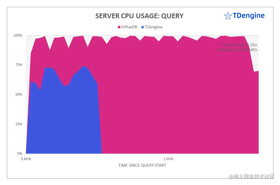 如上图所示,在整个查询过程中,TDengine 内存维持在一个相对平稳的状态,平均使用约为 12GB;InfluxDB 内存占用在整个查询过程中保持平稳,平均约为 10GB。