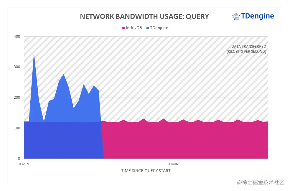 上图展示了两大系统在查询过程中服务器端上行和下行的网络带宽情况,负载状况基本上和 CPU 状况相似。其中 TDengine 网络带宽开销最高,因为在最短的时间内就完成了全部查询,需要将查询结果返回给客户端。
