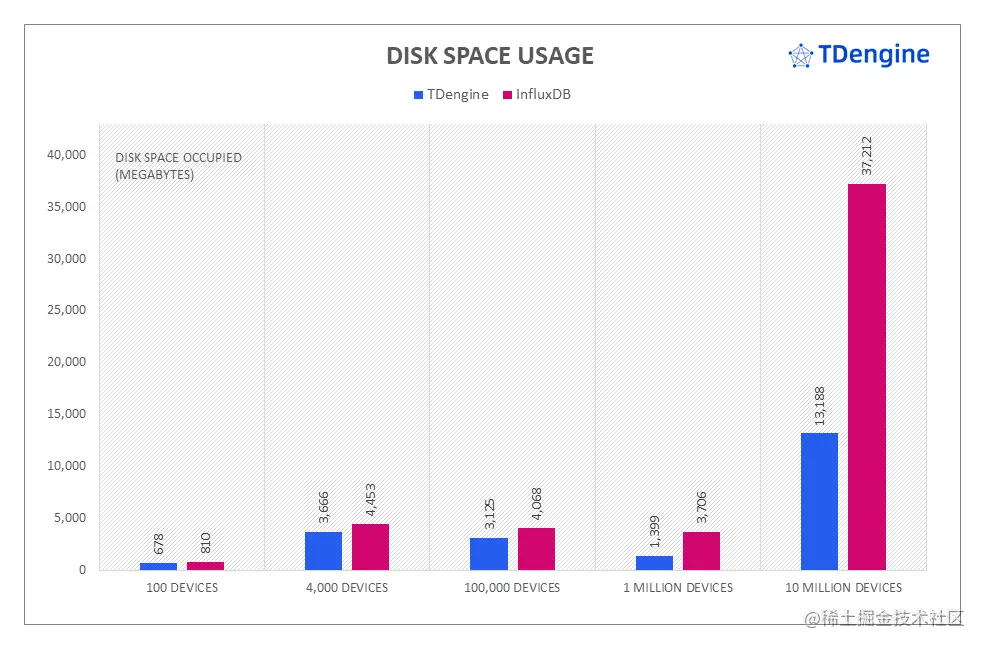 在两大系统数据完全落盘以后,我们对 TDengine 和 InfluxDB 在不同场景下的磁盘空间占用也进行了比较。