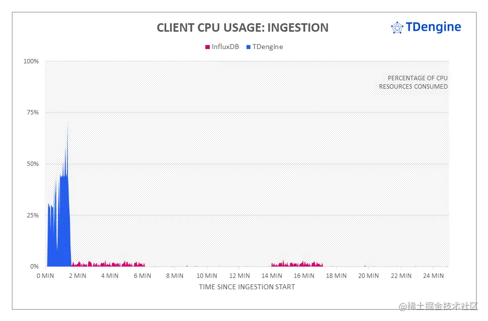 从上图可以看到,客户端上 TDengine 对 CPU 的需求大于 InfluxDB。整体来说,在整个写入过程中,InfluxDB 客户端负载计算资源占用较低,对客户端压力小,这是因为其写入的压力基本上完全集中在服务端,但这种模式很容易导致服务端成为瓶颈。TDengine 在客户端的开销最大,峰值瞬间达到了 70%,然后快速回落。但综合服务器与客户端的资源开销来看,TDengine 写入持续时间更短,在系统整体 CPU 开销上TDengine 仍然具有优势。