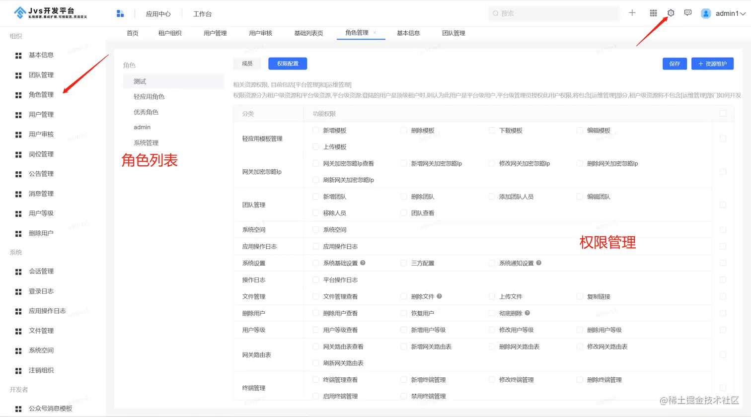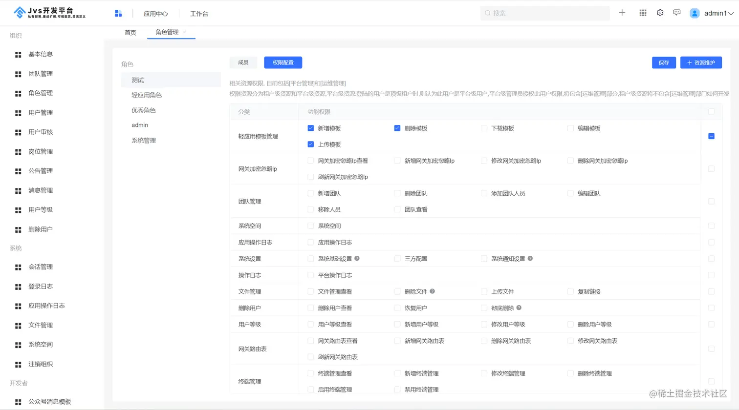 点击权限配置,这里可以设置这个角色对应的权限