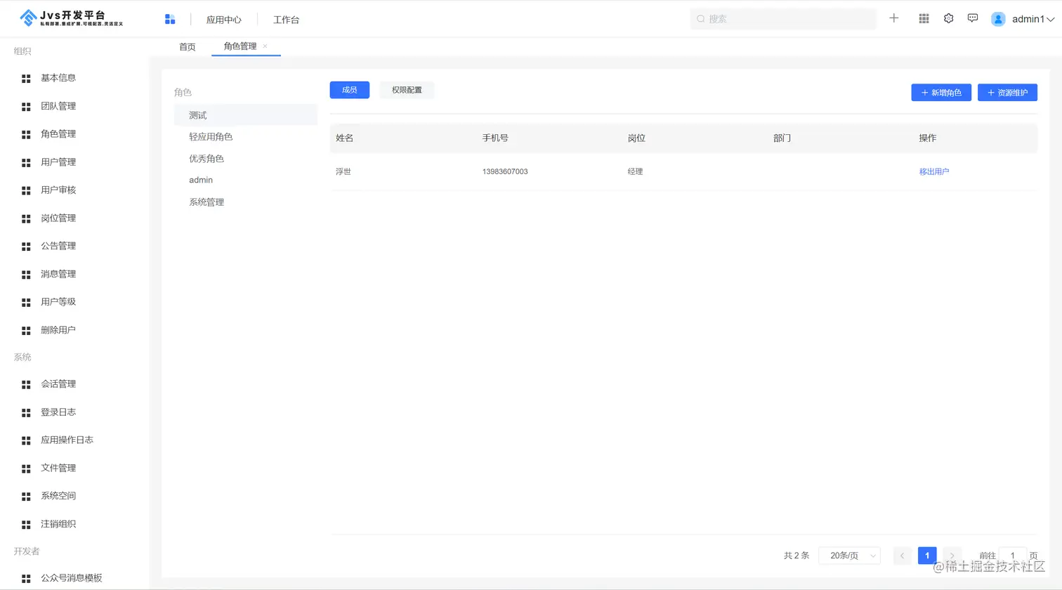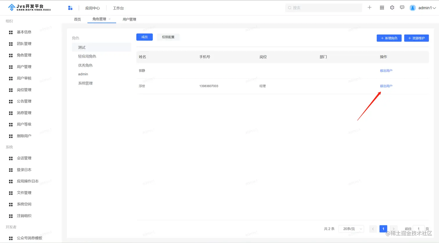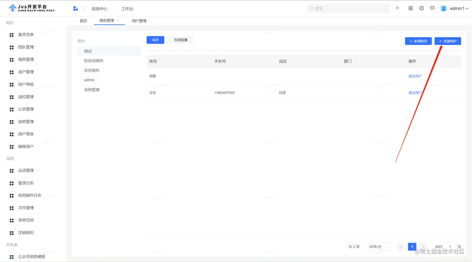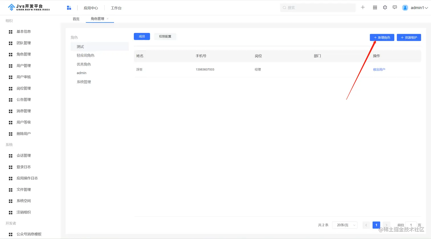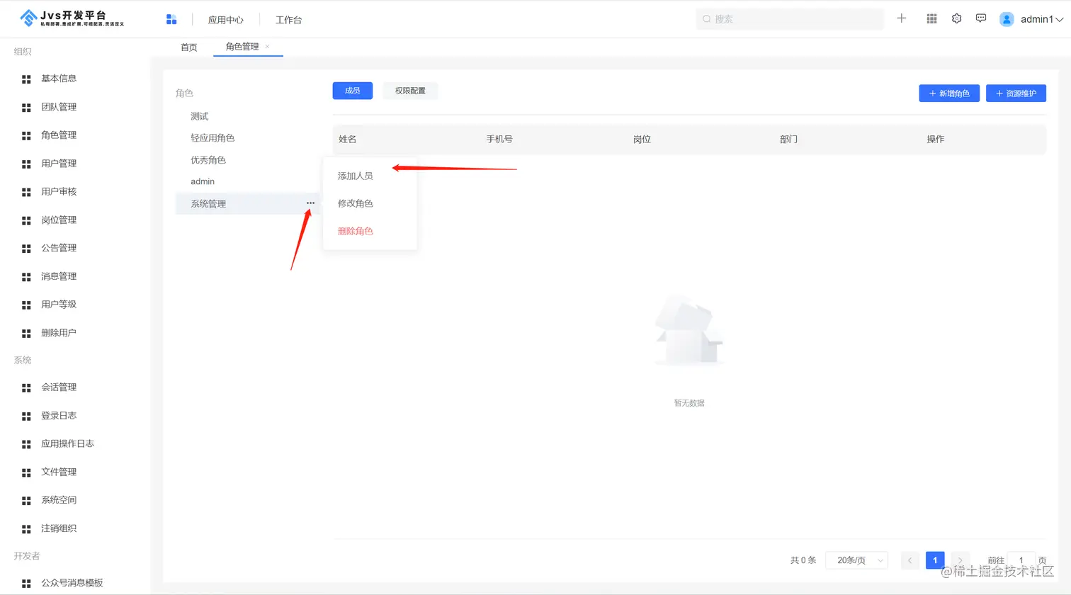 点击平台管理,进入角色管理界面,右侧是展示目前平台内部已经有的角色配置,点击成员,表示该角色下已经有的用户列表