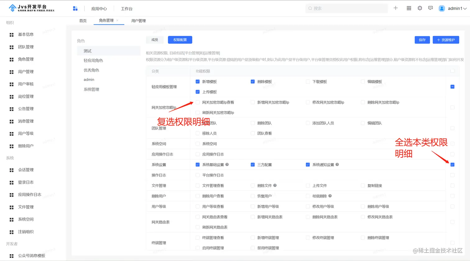 在权限配置的界面,可以点击勾选权限的具体明细项, 也可以点击本类的全选操作,如下图所示: