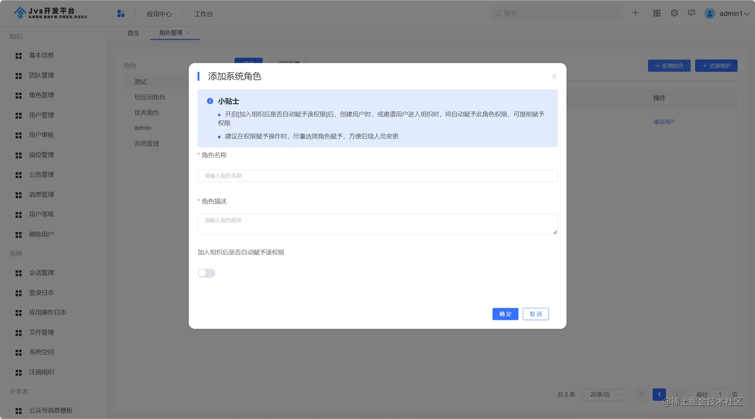 点击新增角色,填写角色名称、角色描述,设置自动赋予角色开关,这里自动赋予角色开关是表示,用户加入组织(新用户、老用户申请加入)后,系统自动给对应用户赋予的角色