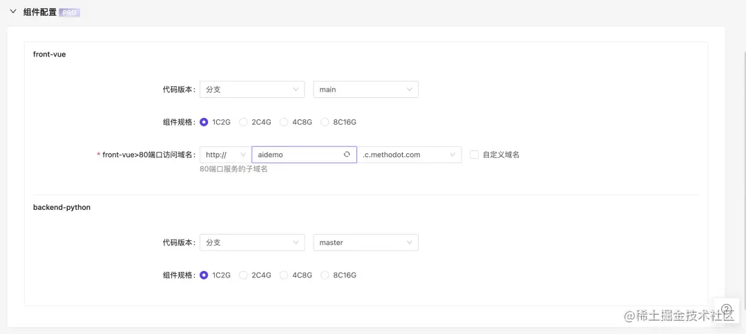 进入发布配置页面:选择组件用于部署服务的代码分支;需要提供访问域名的端口填写域名信息,最后点击发布。