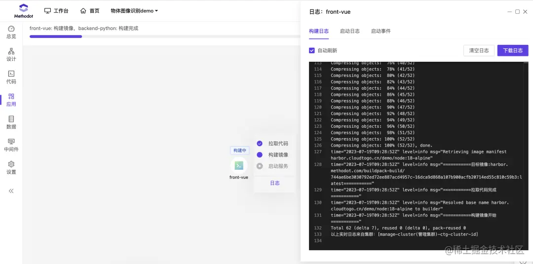 在这个页面中,可以看到各组件所处的步骤和日志信息。其中:构建日志是代码拉取编译构建镜像整个过程的日志,启动日志是服务就绪前控制台输出的日志,启动事件是服务在k8s集群中的部署和调度信息。