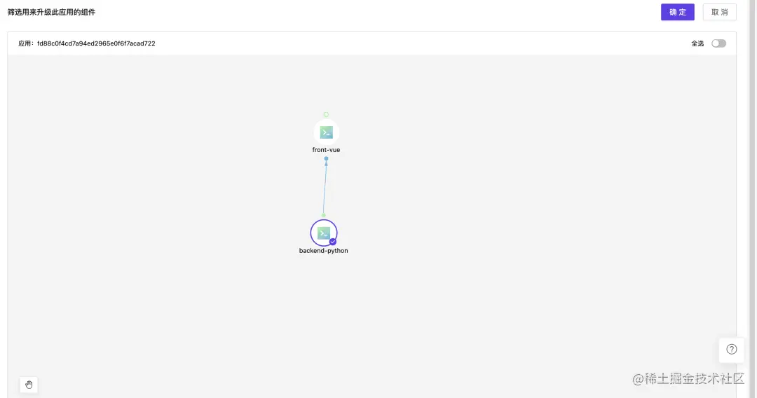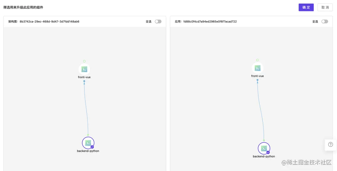 选择此次需要更新的组件,左侧为用于更新的应用的架构图,右侧为目前应用的真实服务情况。