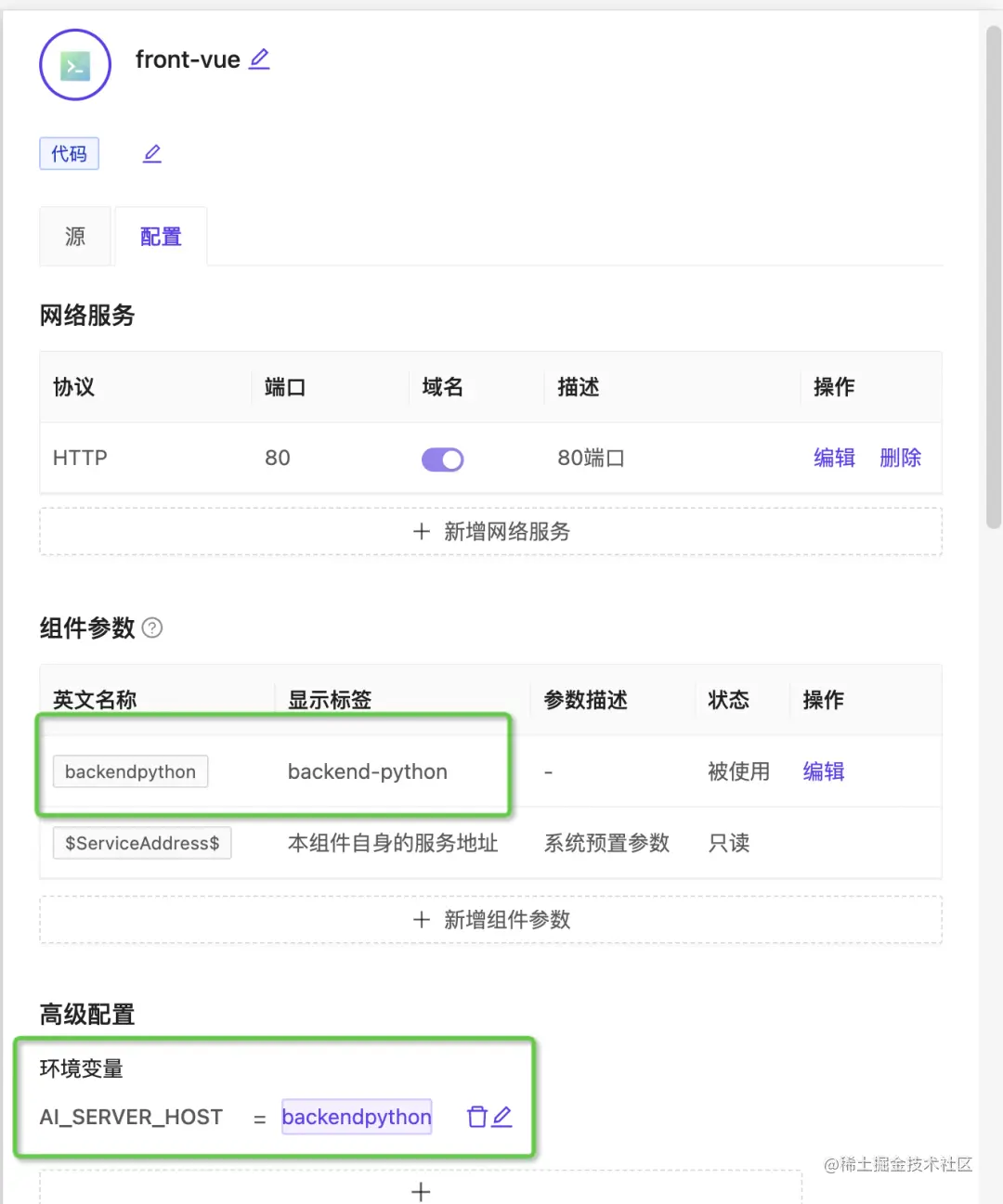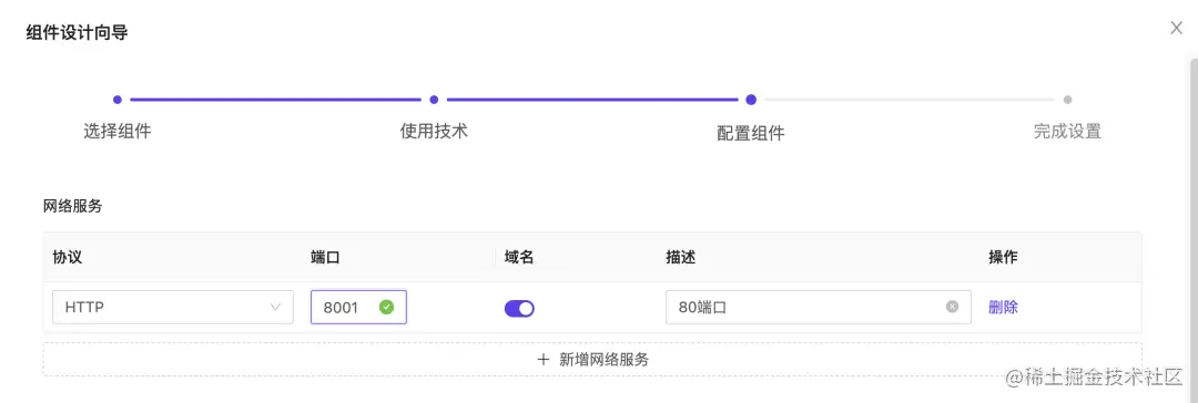 声明端口:添加服务对外暴露的端口信息(非常重要:填写的端口信息和在代码项目中声明的保持一致),以python项目为例,flask服务的端口在代码中被配置为8001,那么在组件中就需要添加相同的端口信息。同时如果此端口需要对应用外的其他服务提供访问,则需要打开域名开关,为端口绑定可访问的域名地址。