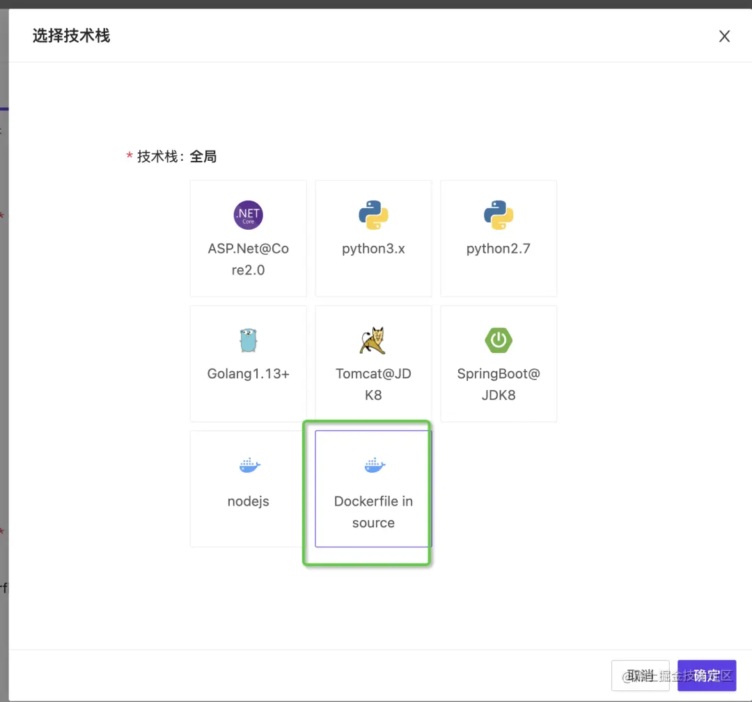 也可以根据项目的实际需求,自行在代码项目中维护Dockerfile,在技术栈选择时,选择【Dockerfile in source】,并提供Dockerfile在项目下的真实路径,平台会依此构建镜像。