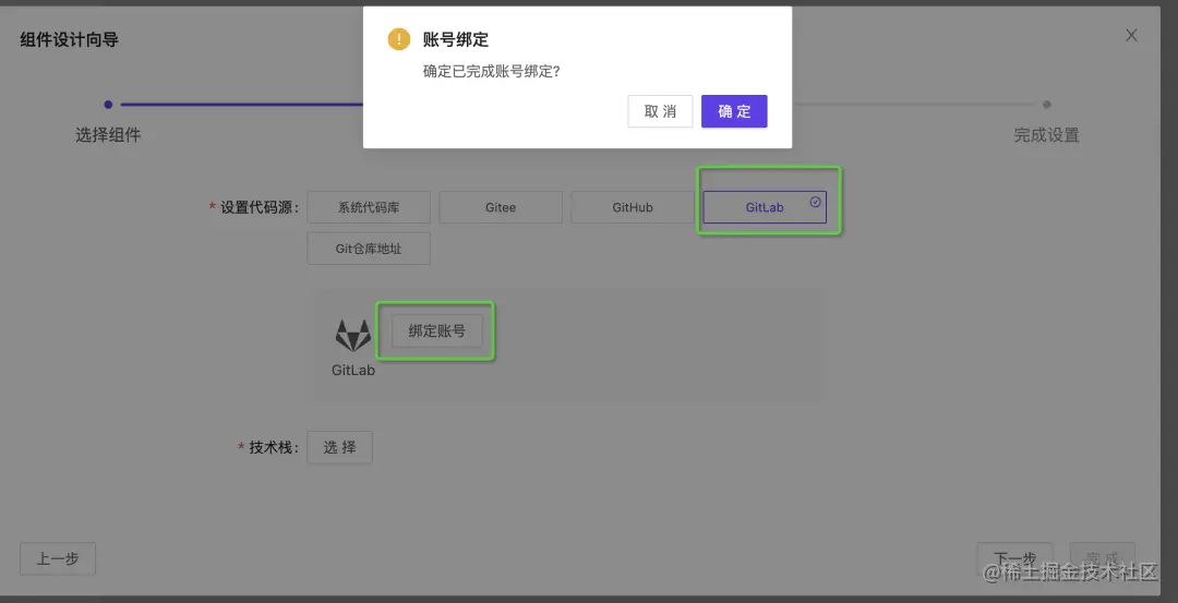 在架构图中首次新增代码类型的组件,需要绑定代码库的账号信息: