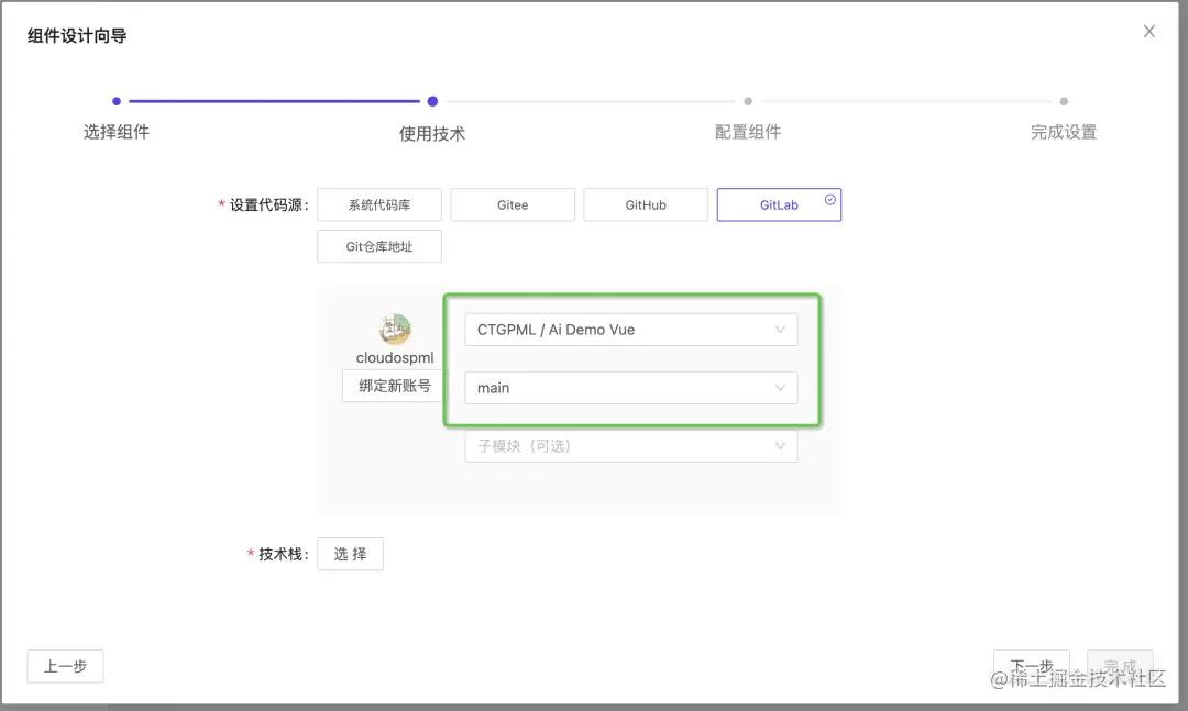 完成绑定后,选择组件源码所在的代码仓库,选择默认分支: