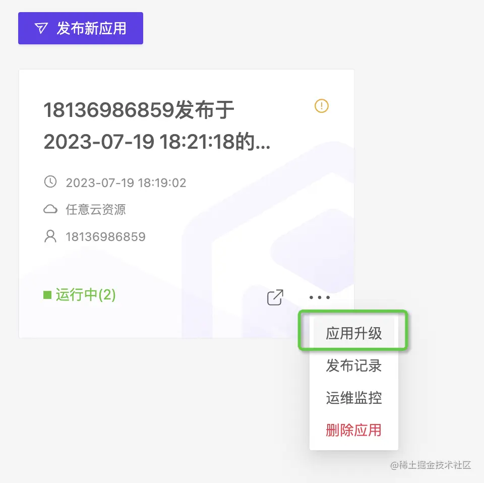 在应用的发布有问题、架构图配置有变更或者代码有更新时,通过【应用升级】来更新应用。