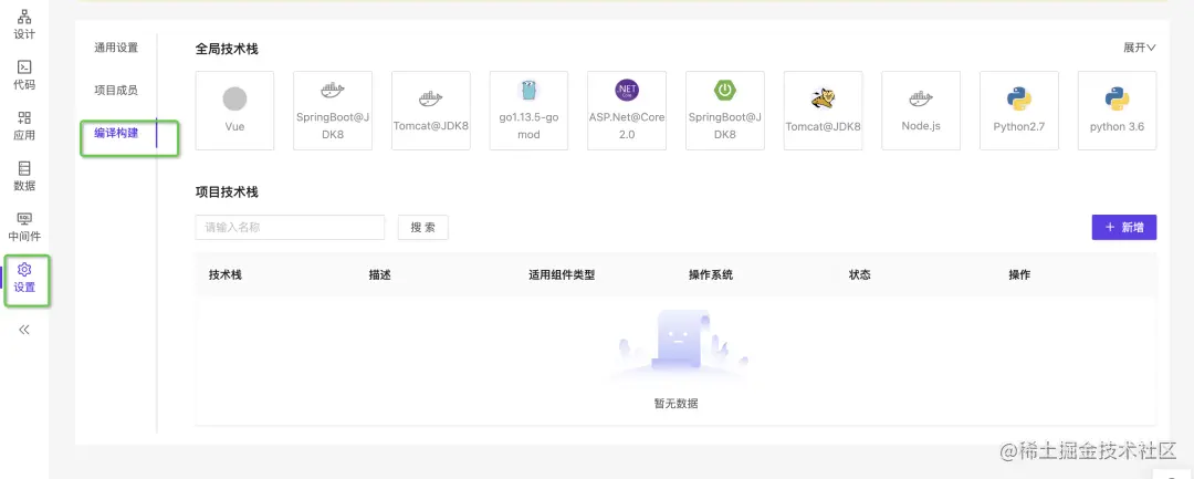 代码组件需要制作成为镜像才能完成部署,镜像构建可以选择平台中提供的通用技术栈,技术栈的具体信息可以在【项目设置】-【编译构建】中查看: