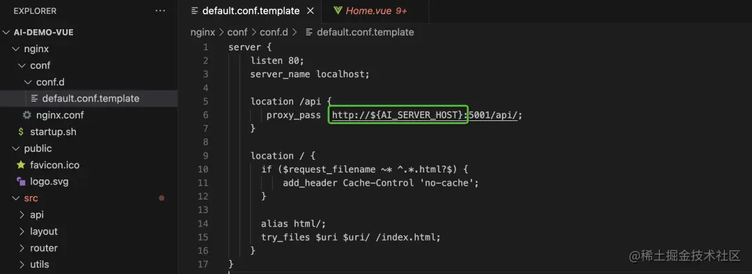 以前端服务请求后端java地址为例:从代码中可以看出前端nginx请求的后端地址前缀是从系统环境变量AI_SERVER_HOST中获取的。