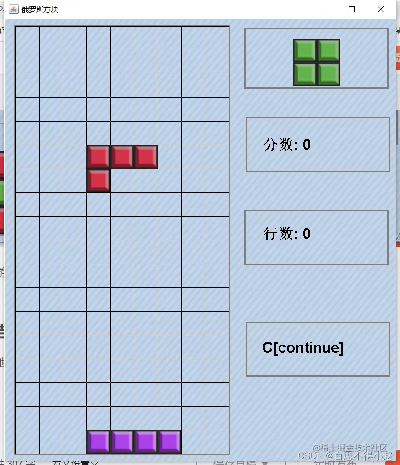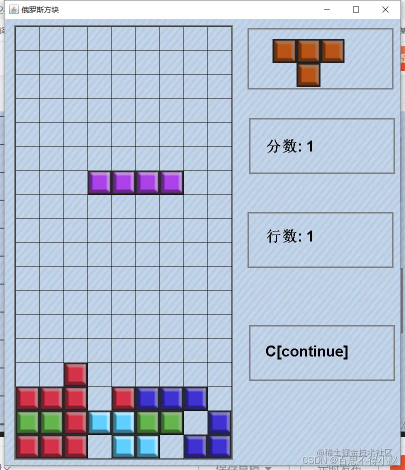游戏开始,方快下落,右边区域展示即将下落的方块图、分数、消除的行数以及游戏切换的状态。