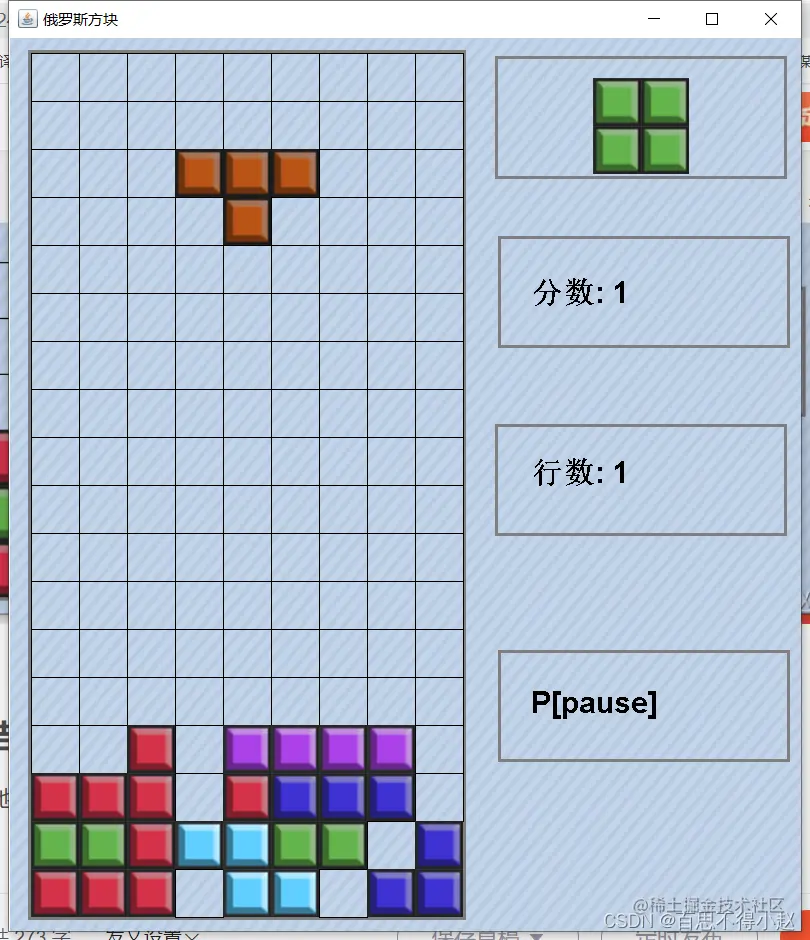 按下空格键,方块瞬间下落, 按下P键游戏暂停,消除一行分数为1(此处由分数池进行控制)