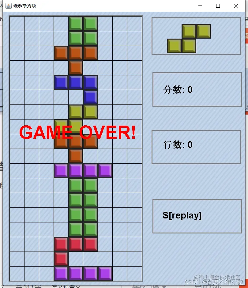 方块占满,游戏结束,此时可以按下S键重新开始游戏。