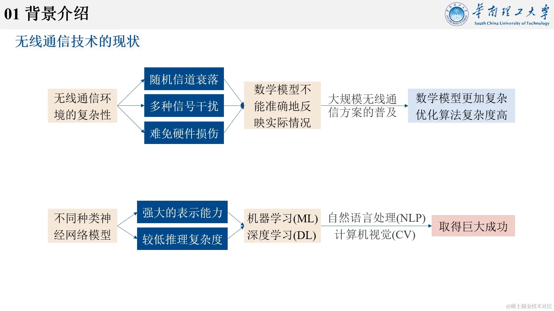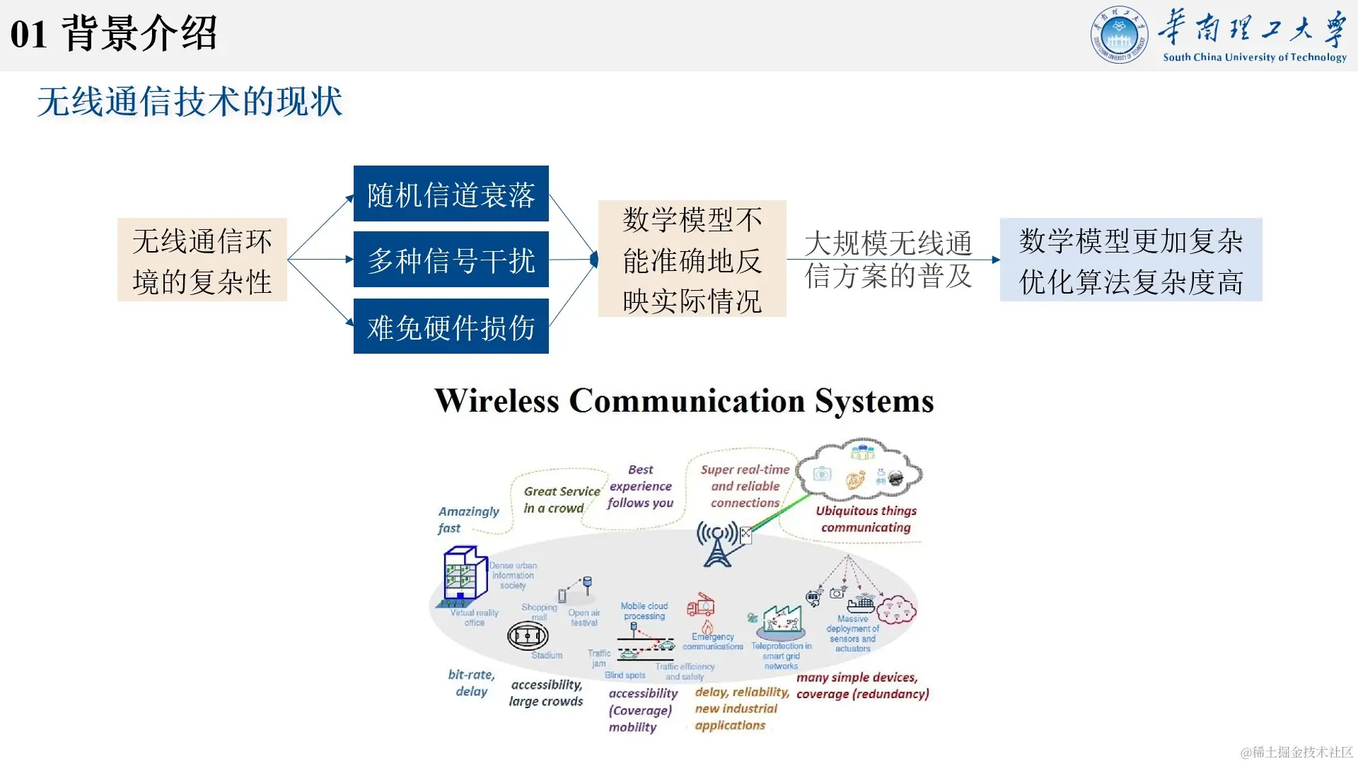 由于无线通信环境的复杂性,如随机信道衰落和干扰,以及不可避免的硬件损伤所引起的非线性等情况,使得无线通信系统的数学模型有时不能准确地反映实际情况。此外,随着大规模无线通信方案(如大规模MIMO)的普及,相应的数学模型变得更加复杂,相关优化算法的计算复杂度也变得更高。